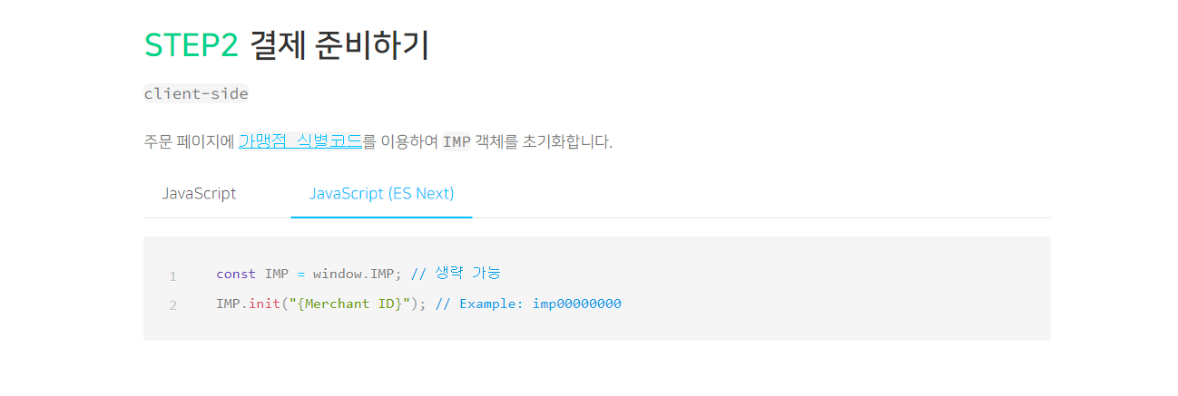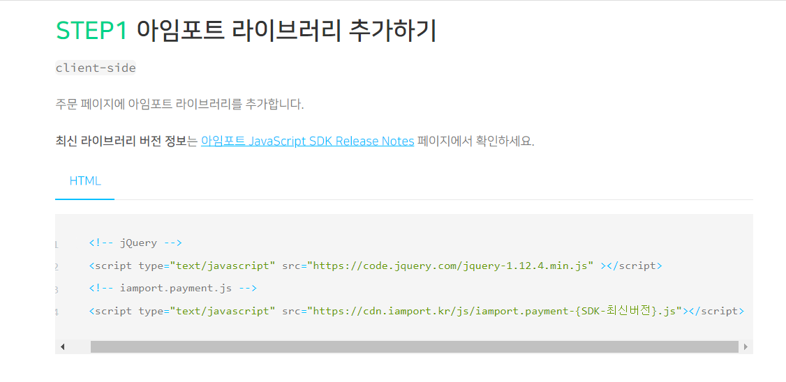일반결제 연동하기 이 문서는 일반 결제 기능을 구현하는 방법을 설명합니다. STEP1아임포트 라이브러리 추가하기 client-side 주문 페이지에 아임포트 라이브러리를 추가합니다.최신 라이브러리