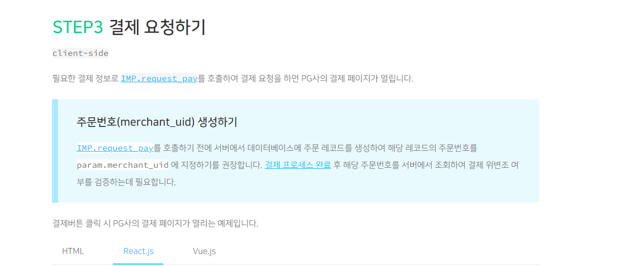 일반결제 연동하기 이 문서는 일반 결제 기능을 구현하는 방법을 설명합니다. STEP1아임포트 라이브러리 추가하기 client-side 주문 페이지에 아임포트 라이브러리를 추가합니다.최신 라이브러리