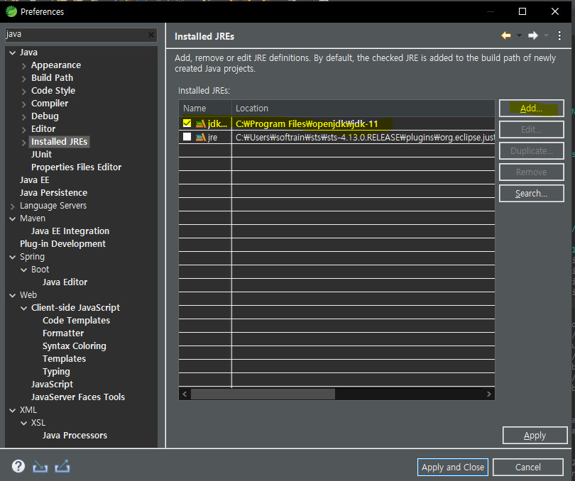 여기서 add 누르고 jdk를 추가하고 apply